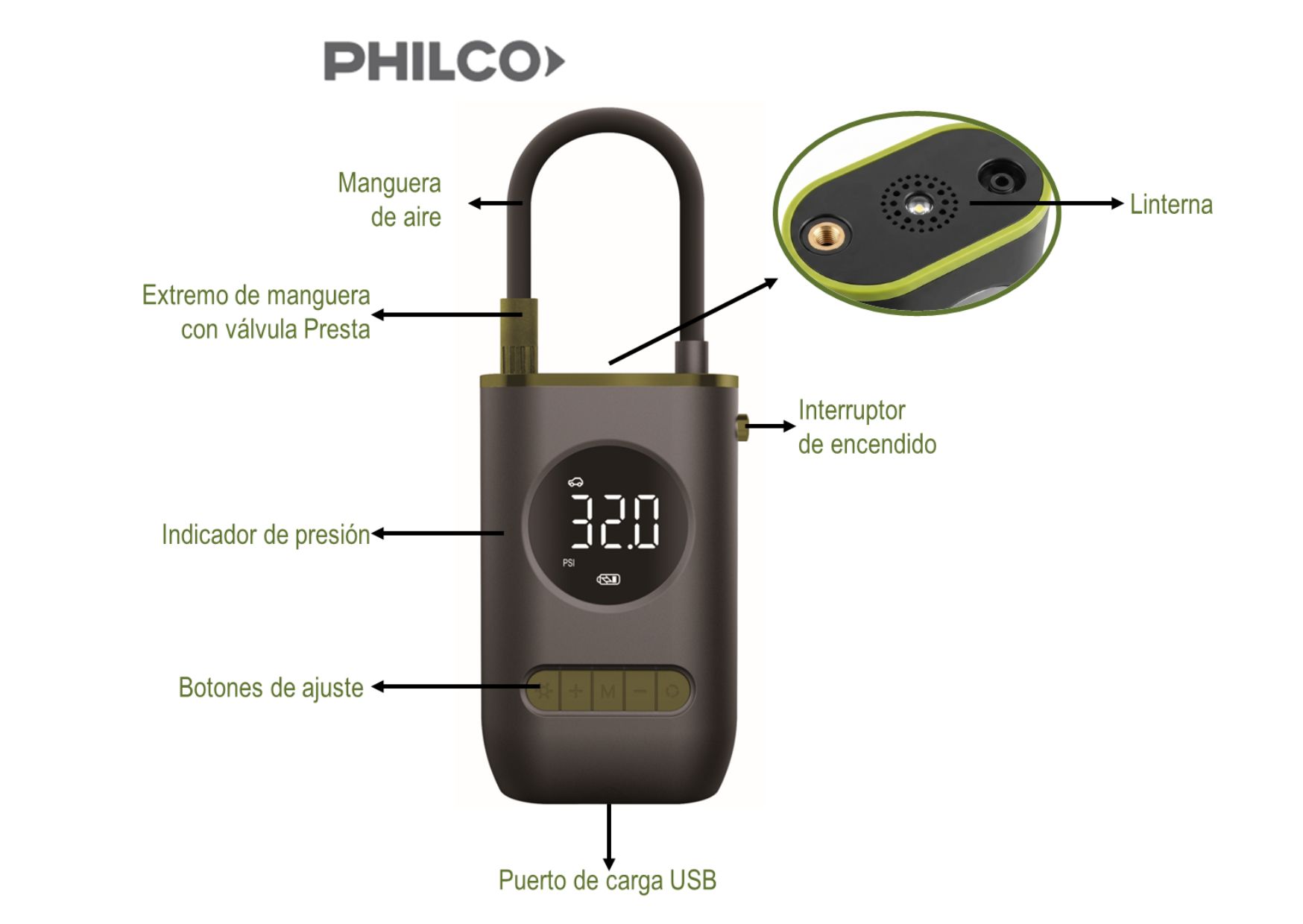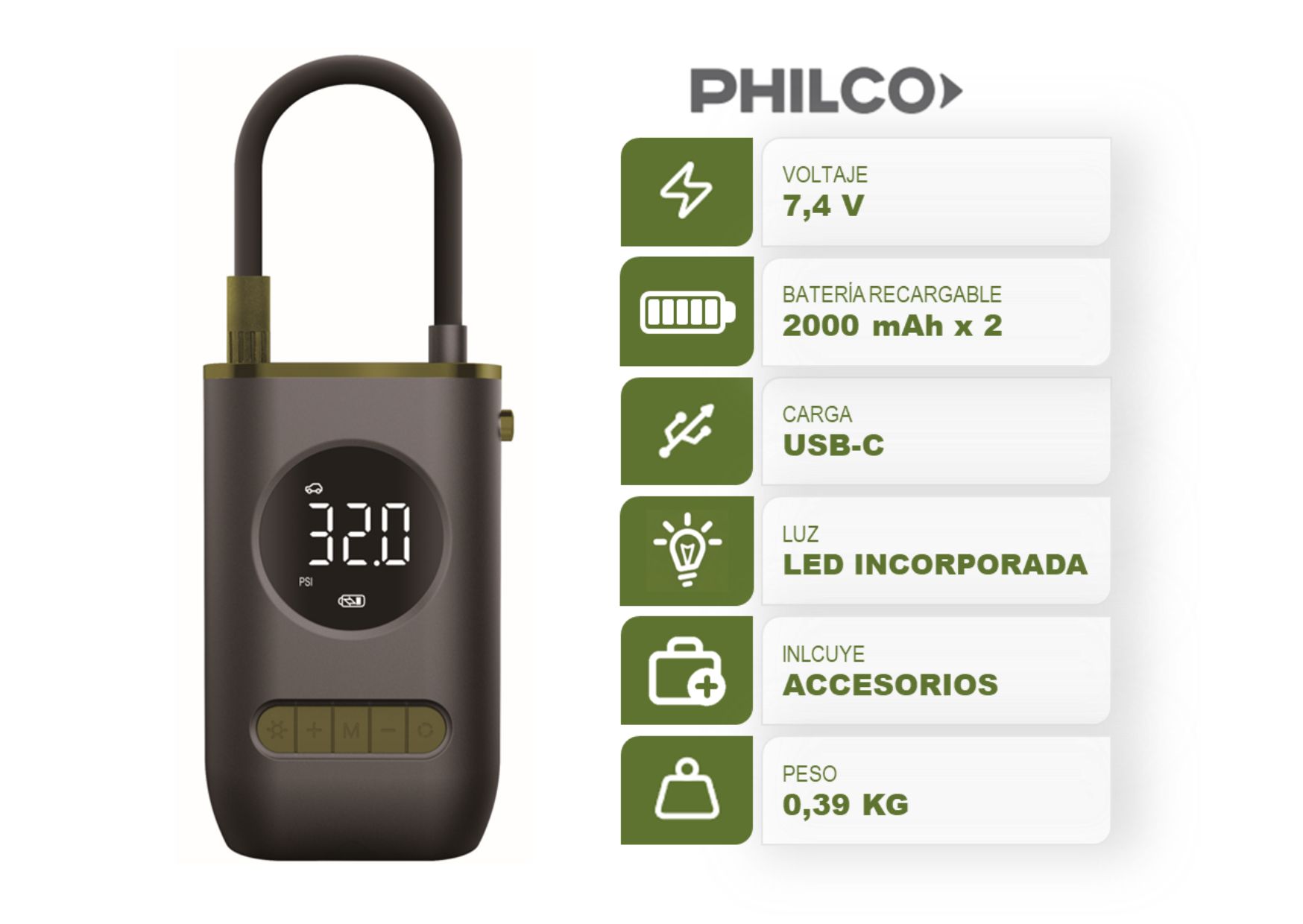 INFLADOR COMPRESOR USB A BATERÍA. - 94I151P